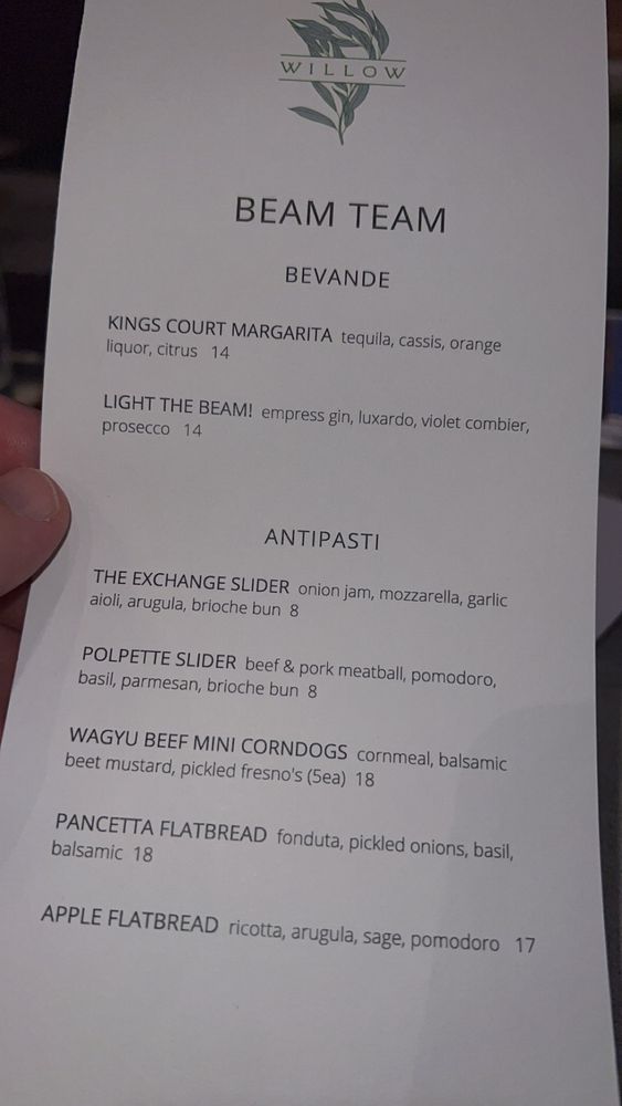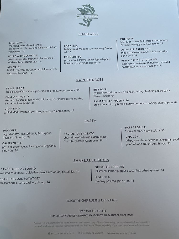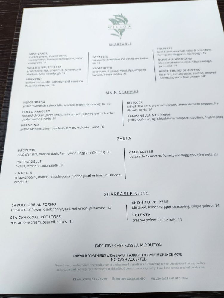 Introducing the menu at Willow Sacramento, an upscale Italian restaurant in Sacramento, CA. This trendy and intimate spot offers a variety of dining options, from takeout to private dining. The menu features pescatarian dishes and limited vegetarian options. Customers rave about the delicious food and excellent cocktails, with standout dishes like the Willow Bruschetta and flavorful pork loin. The atmosphere is praised as romantic and the service as top-notch. While some reviewers mention the portions being a bit pricey, the overall dining experience seems to be worth it. With options for valet parking, outdoor seating, and even compostable containers, Willow Sacramento provides a unique and satisfying dining experience.